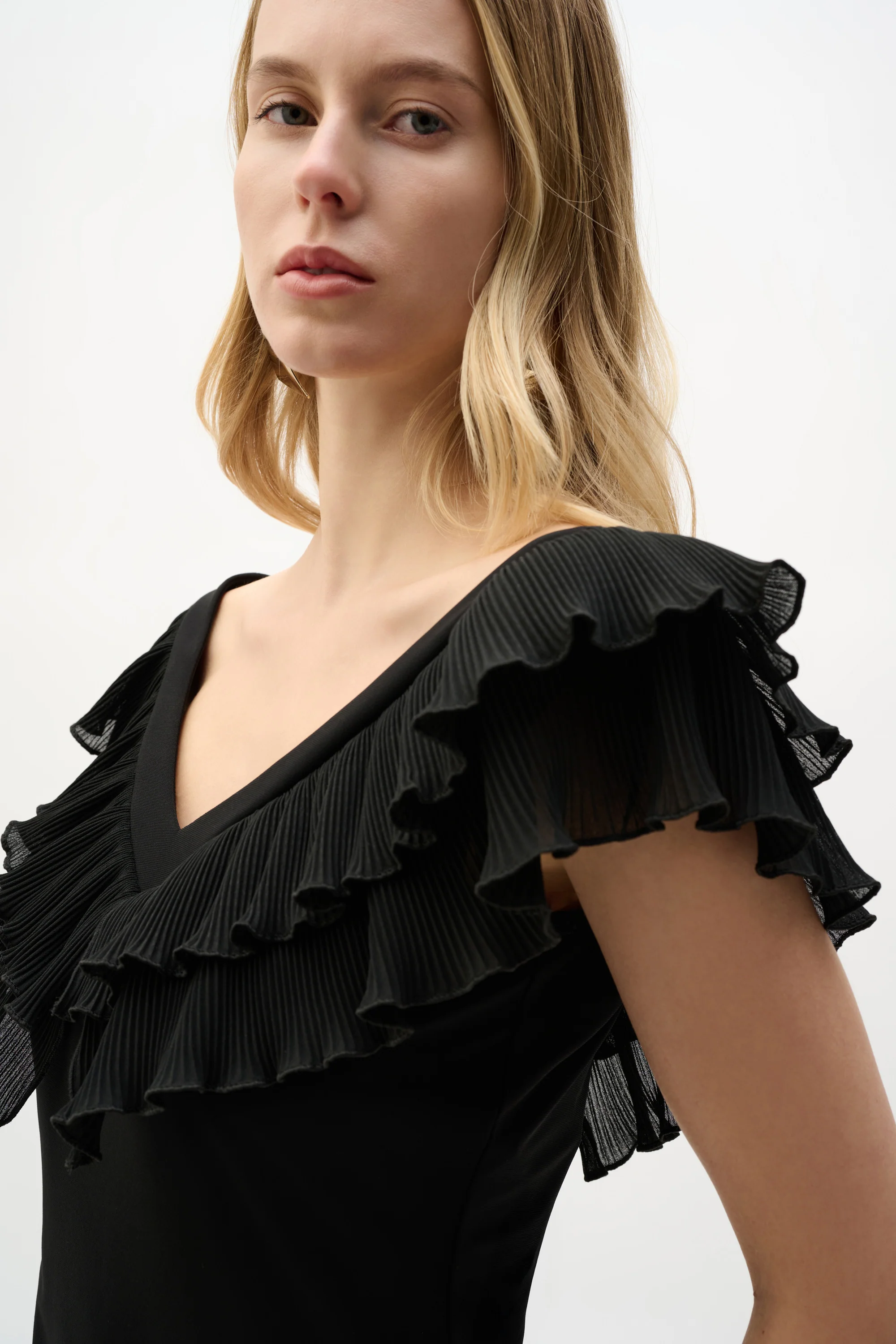 Details: V-neckline with wide band. Sleeveless. Two-layer pleated detail at neckline.
