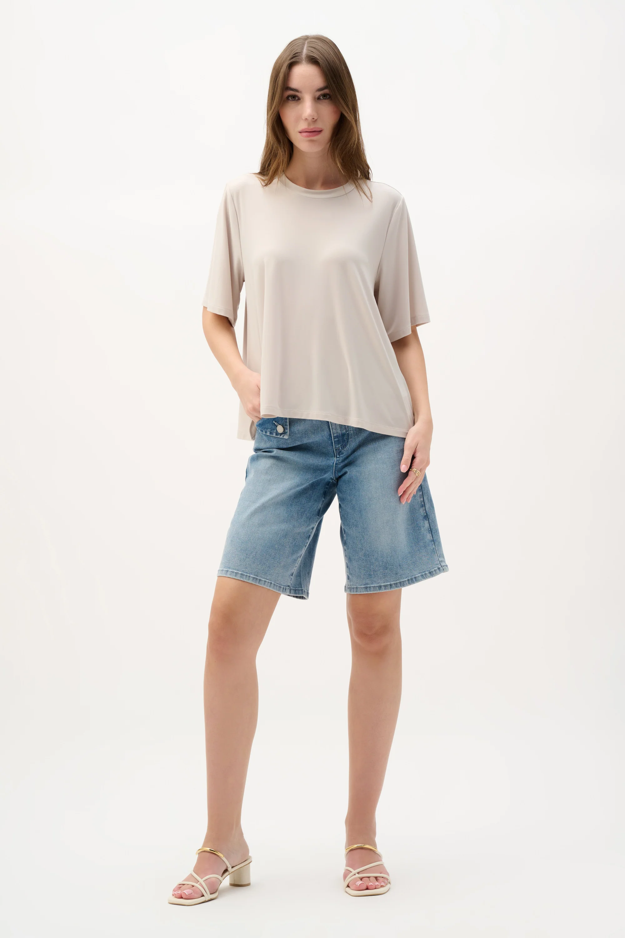 Crafted from a premium silky knit, this trapeze top is defined by its fluid, effortless drape and sophisticated minimalist design. The silhouette features a clean crew neckline and classic short sleeves, providing a polished frame that works beautifully as a standalone piece or a foundational layer.